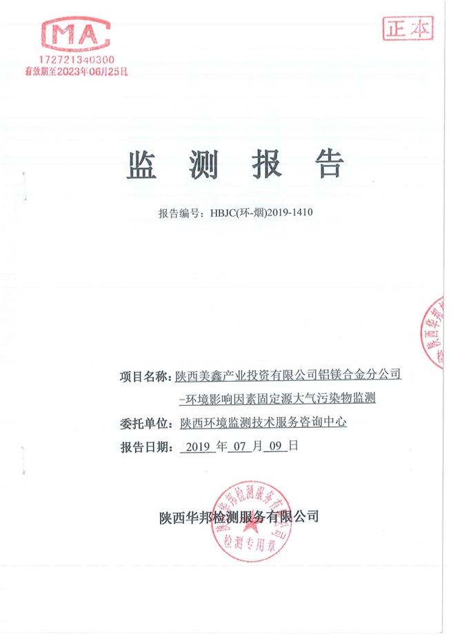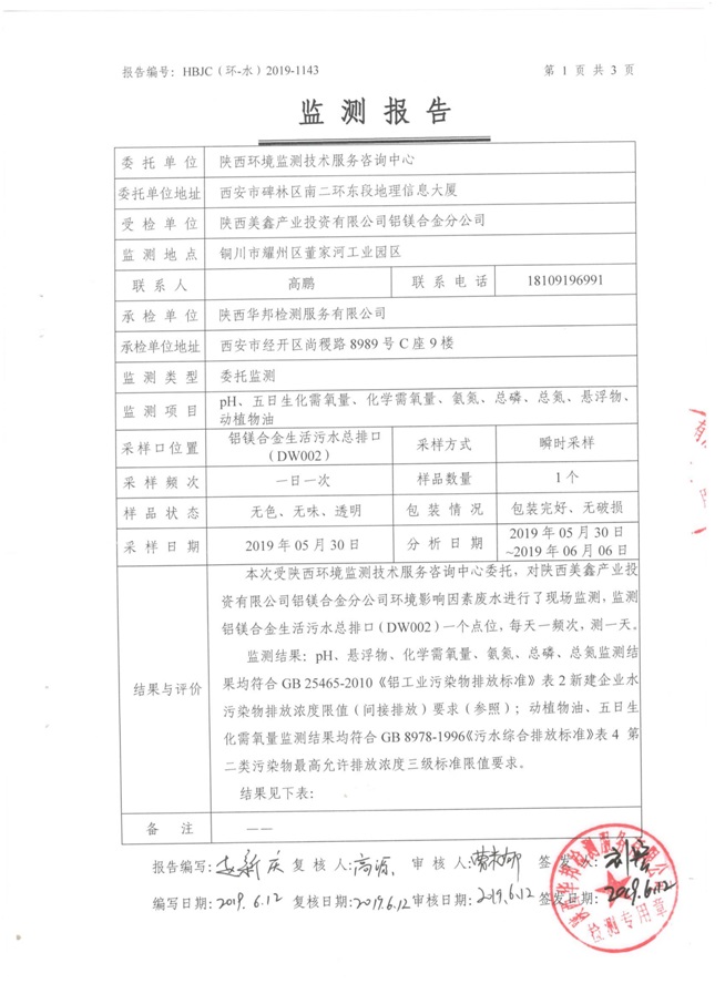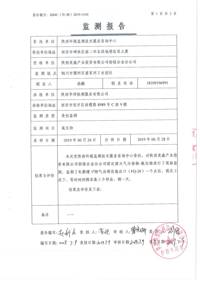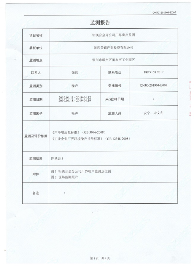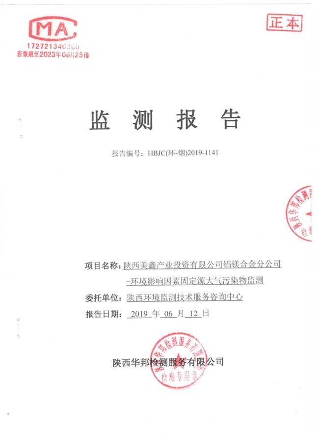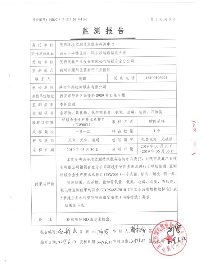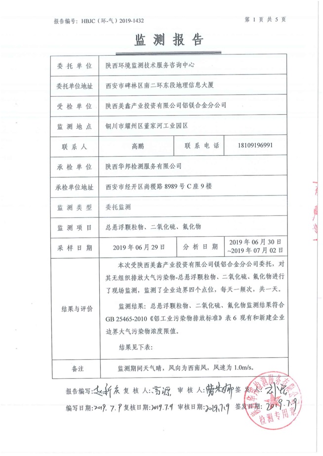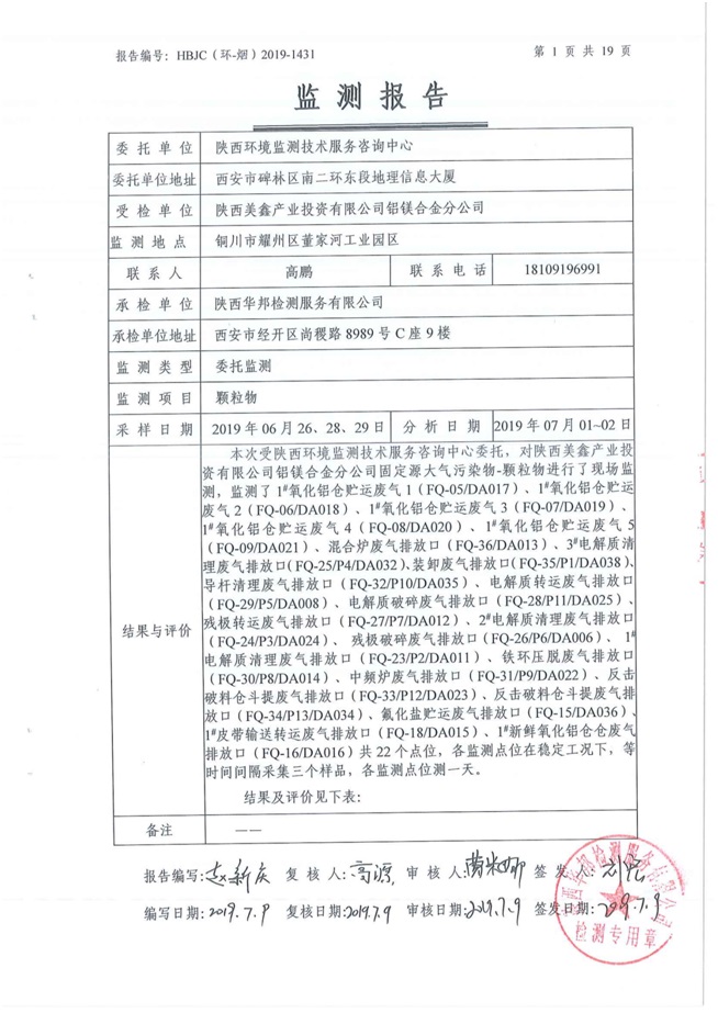 一、基礎(chǔ)信息: 陜西美鑫產(chǎn)業(yè)投資有限公司 統(tǒng)一社會(huì)信用代碼:91610200567136996Y 法定代表人:高曉兵 生產(chǎn)地址:陜西省銅川市董家河工業(yè)園區(qū) 聯(lián)系方式:09196982605 生產(chǎn)經(jīng)營(yíng)和管理服務(wù)的主要內(nèi)容、產(chǎn)品及規(guī)模: 美鑫公司在陜西有色、陜西煤化兩大集團(tuán)的正確領(lǐng)導(dǎo)下,在銅川市委、市政府的關(guān)心支持下,充分利用銅川資源型城市轉(zhuǎn)型政策,依托園區(qū)區(qū)位優(yōu)勢(shì),擬投資150億元,建設(shè)年產(chǎn)30萬(wàn)噸預(yù)焙陽(yáng)極、120萬(wàn)噸煤礦、30萬(wàn)噸鋁鎂合金及配套動(dòng)力站、20萬(wàn)噸鋁深加工、年吞吐量500—800萬(wàn)噸物流園等循環(huán)經(jīng)濟(jì)項(xiàng)目。該集群項(xiàng)目已被列入《陜西省國(guó)民經(jīng)濟(jì)和社會(huì)發(fā)展第十二個(gè)五年規(guī)劃綱要》,為陜西省“58123”項(xiàng)目之一。美鑫公司以循環(huán)經(jīng)濟(jì)為路徑,堅(jiān)持經(jīng)濟(jì)增長(zhǎng)與環(huán)境保護(hù)協(xié)調(diào)發(fā)展,聚合資源與資本,走綠色發(fā)展、清潔發(fā)展、低碳發(fā)展的循環(huán)經(jīng)濟(jì)轉(zhuǎn)型升級(jí)之路。 陜西美鑫鋁鎂合金分公司采用的500kA預(yù)焙陽(yáng)極電解槽,自動(dòng)化程度高,電解槽打殼、加料全過(guò)程均由微機(jī)自動(dòng)控制,從而使槽罩開(kāi)啟次數(shù)顯著降低,電解槽集氣效率能夠達(dá)到99%,大大地減少了煙氣無(wú)組織排放。項(xiàng)目配置了2套電解煙氣凈化系統(tǒng),經(jīng)捕集的煙氣通過(guò)排煙支管進(jìn)入排煙總管,采用電解鋁生產(chǎn)原料—氧化鋁吸附阻濾煙氣中的氟化氫氣體及含氟煙塵,吸附后的載負(fù)氧化鋁進(jìn)入袋式除塵器,經(jīng)氣固分離后進(jìn)入石灰石—石膏脫硫系統(tǒng)脫硫。 陜西美鑫產(chǎn)業(yè)投資有限公司鋁鎂合金分公司2019年2季度自行監(jiān)測(cè)如下: 二、監(jiān)測(cè)方案: 1 大氣污染源監(jiān)測(cè)