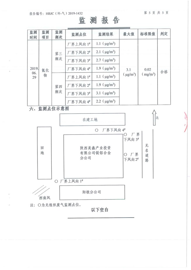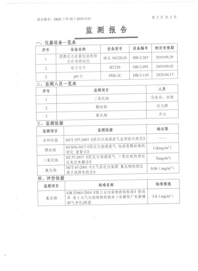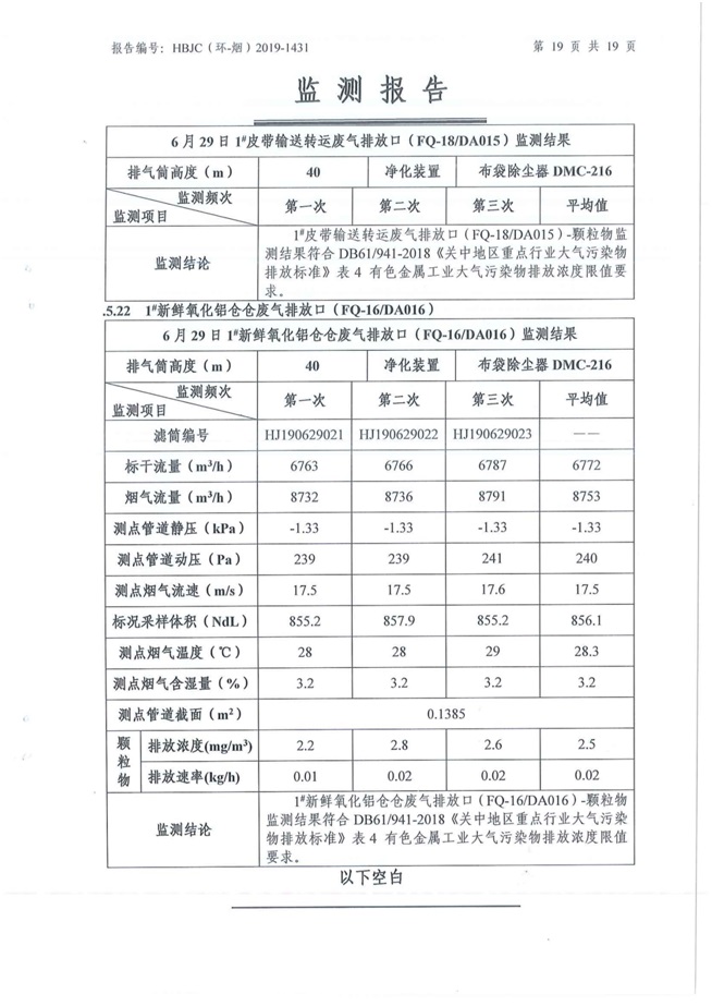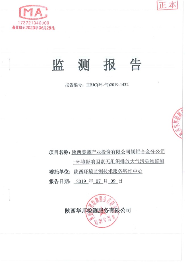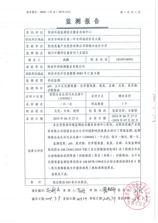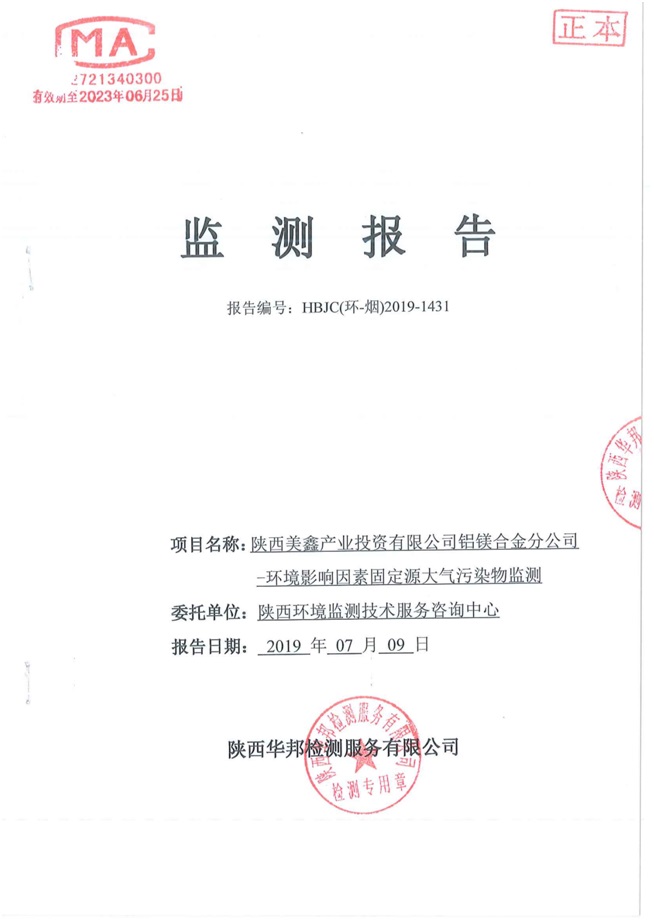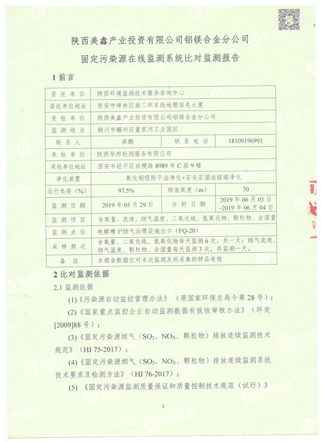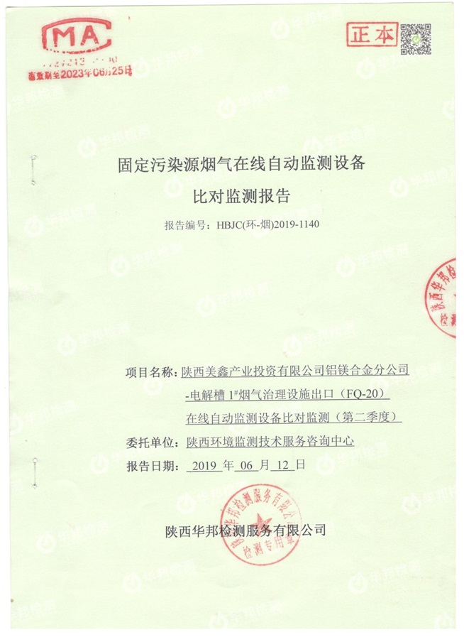一、基礎(chǔ)信息: 陜西美鑫產(chǎn)業(yè)投資有限公司 統(tǒng)一社會(huì)信用代碼:91610200567136996Y 法定代表人:高曉兵 生產(chǎn)地址:陜西省銅川市董家河工業(yè)園區(qū) 聯(lián)系方式:09196982605 生產(chǎn)經(jīng)營(yíng)和管理服務(wù)的主要內(nèi)容、產(chǎn)品及規(guī)模: 美鑫公司在陜西有色、陜西煤化兩大集團(tuán)的正確領(lǐng)導(dǎo)下,在銅川市委、市政府的關(guān)心支持下,充分利用銅川資源型城市轉(zhuǎn)型政策,依托園區(qū)區(qū)位優(yōu)勢(shì),擬投資150億元,建設(shè)年產(chǎn)30萬(wàn)噸預(yù)焙陽(yáng)極、120萬(wàn)噸煤礦、30萬(wàn)噸鋁鎂合金及配套動(dòng)力站、20萬(wàn)噸鋁深加工、年吞吐量500—800萬(wàn)噸物流園等循環(huán)經(jīng)濟(jì)項(xiàng)目。該集群項(xiàng)目已被列入《陜西省國(guó)民經(jīng)濟(jì)和社會(huì)發(fā)展第十二個(gè)五年規(guī)劃綱要》,為陜西省“58123”項(xiàng)目之一。美鑫公司以循環(huán)經(jīng)濟(jì)為路徑,堅(jiān)持經(jīng)濟(jì)增長(zhǎng)與環(huán)境保護(hù)協(xié)調(diào)發(fā)展,聚合資源與資本,走綠色發(fā)展、清潔發(fā)展、低碳發(fā)展的循環(huán)經(jīng)濟(jì)轉(zhuǎn)型升級(jí)之路。 陜西美鑫鋁鎂合金分公司采用的500kA預(yù)焙陽(yáng)極電解槽,自動(dòng)化程度高,電解槽打殼、加料全過(guò)程均由微機(jī)自動(dòng)控制,從而使槽罩開(kāi)啟次數(shù)顯著降低,電解槽集氣效率能夠達(dá)到99%,大大地減少了煙氣無(wú)組織排放。項(xiàng)目配置了2套電解煙氣凈化系統(tǒng),經(jīng)捕集的煙氣通過(guò)排煙支管進(jìn)入排煙總管,采用電解鋁生產(chǎn)原料—氧化鋁吸附阻濾煙氣中的氟化氫氣體及含氟煙塵,吸附后的載負(fù)氧化鋁進(jìn)入袋式除塵器,經(jīng)氣固分離后進(jìn)入石灰石—石膏脫硫系統(tǒng)脫硫。 陜西美鑫產(chǎn)業(yè)投資有限公司鋁鎂合金分公司2019年2季度自行監(jiān)測(cè)如下: 二、監(jiān)測(cè)方案: 1 大氣污染源監(jiān)測(cè)