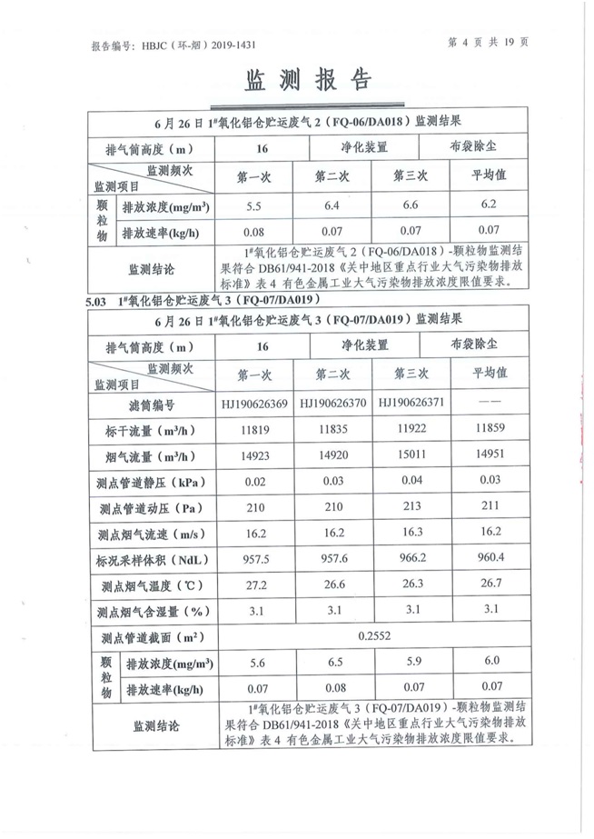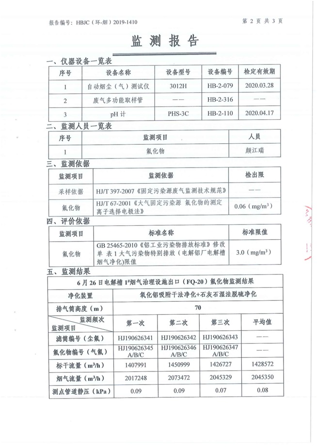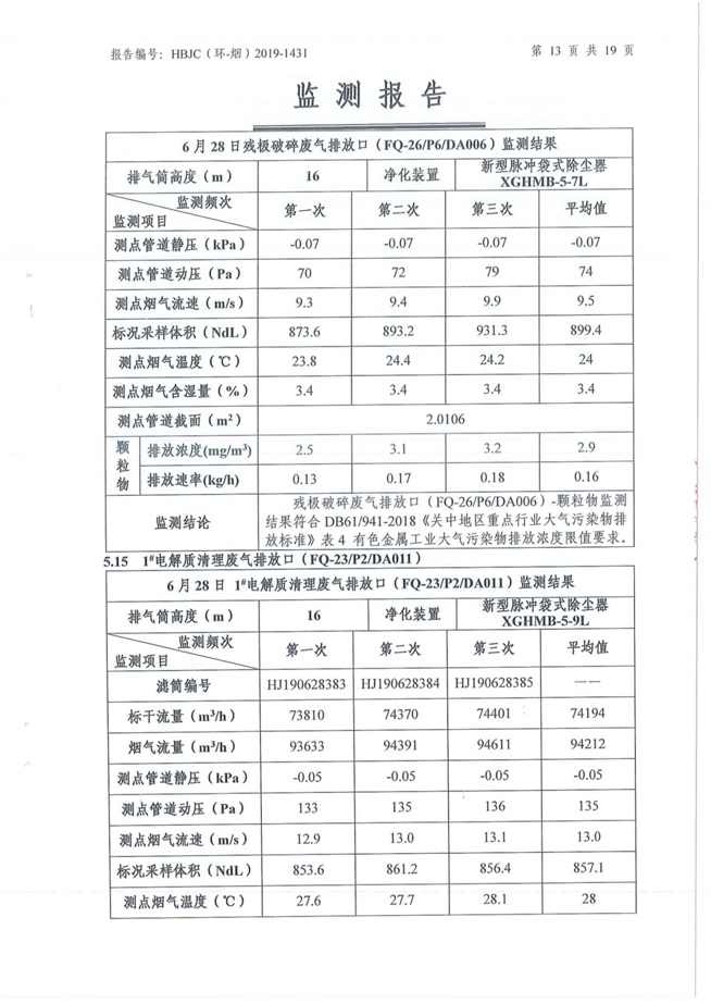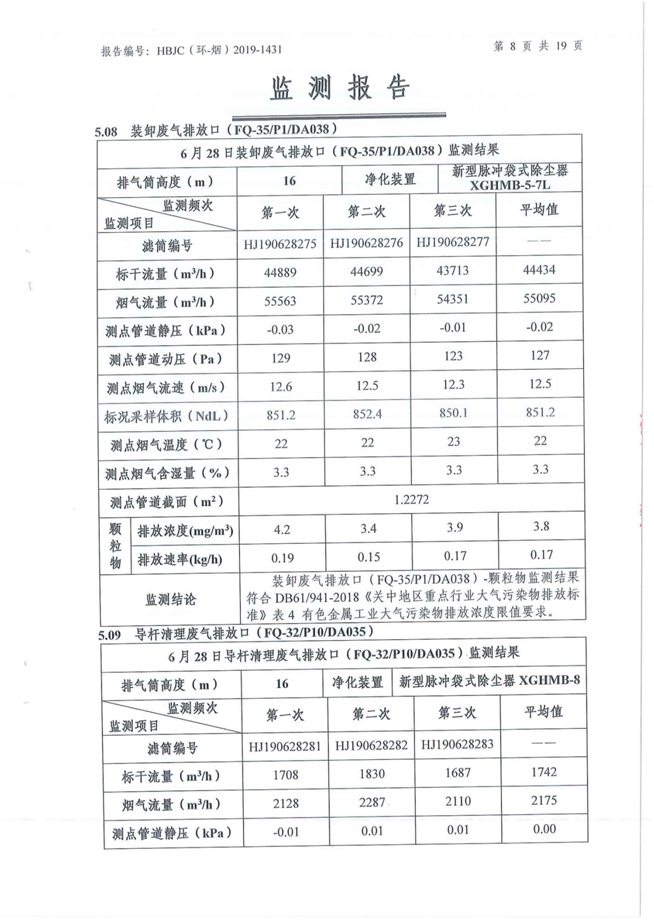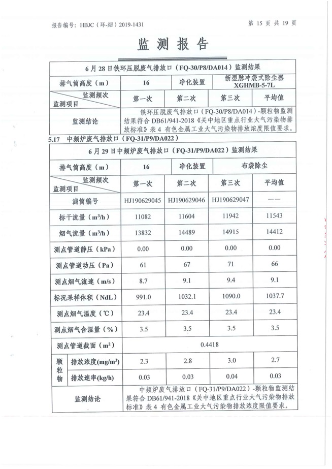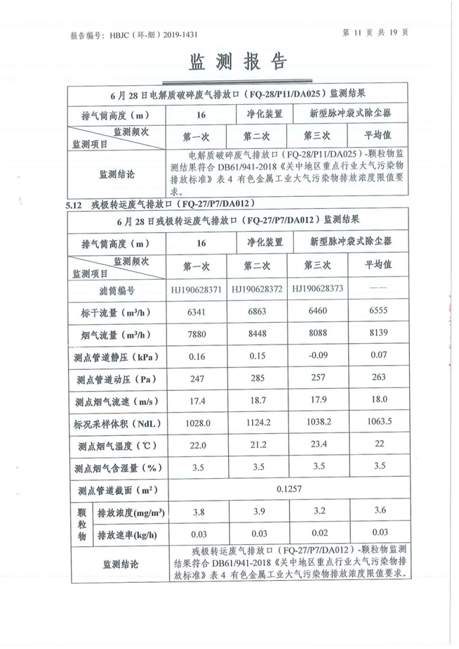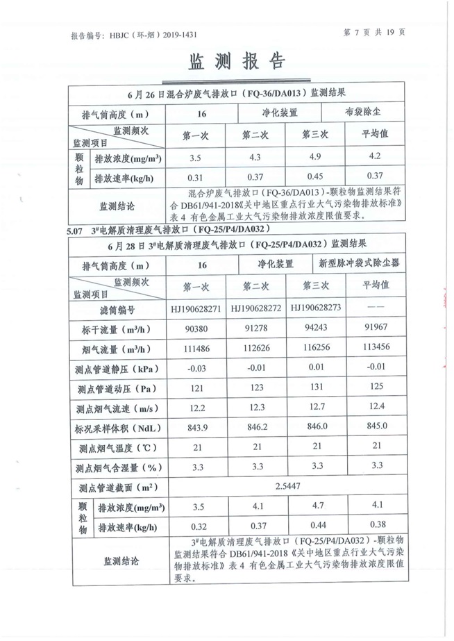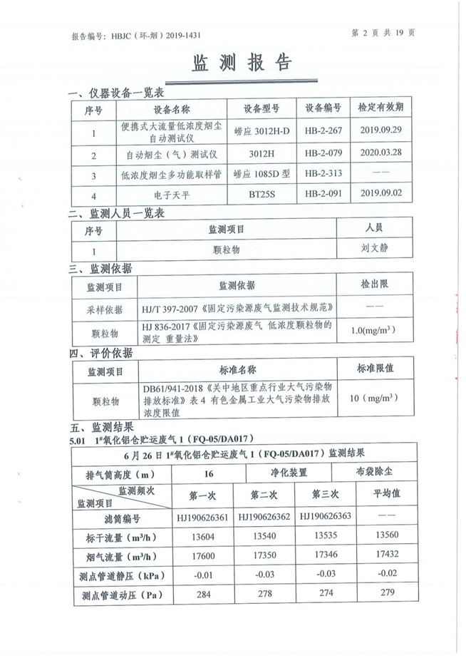 一、基礎(chǔ)信息: 陜西美鑫產(chǎn)業(yè)投資有限公司 統(tǒng)一社會(huì)信用代碼:91610200567136996Y 法定代表人:高曉兵 生產(chǎn)地址:陜西省銅川市董家河工業(yè)園區(qū) 聯(lián)系方式:09196982605 生產(chǎn)經(jīng)營(yíng)和管理服務(wù)的主要內(nèi)容、產(chǎn)品及規(guī)模: 美鑫公司在陜西有色、陜西煤化兩大集團(tuán)的正確領(lǐng)導(dǎo)下,在銅川市委、市政府的關(guān)心支持下,充分利用銅川資源型城市轉(zhuǎn)型政策,依托園區(qū)區(qū)位優(yōu)勢(shì),擬投資150億元,建設(shè)年產(chǎn)30萬(wàn)噸預(yù)焙陽(yáng)極、120萬(wàn)噸煤礦、30萬(wàn)噸鋁鎂合金及配套動(dòng)力站、20萬(wàn)噸鋁深加工、年吞吐量500—800萬(wàn)噸物流園等循環(huán)經(jīng)濟(jì)項(xiàng)目。該集群項(xiàng)目已被列入《陜西省國(guó)民經(jīng)濟(jì)和社會(huì)發(fā)展第十二個(gè)五年規(guī)劃綱要》,為陜西省“58123”項(xiàng)目之一。美鑫公司以循環(huán)經(jīng)濟(jì)為路徑,堅(jiān)持經(jīng)濟(jì)增長(zhǎng)與環(huán)境保護(hù)協(xié)調(diào)發(fā)展,聚合資源與資本,走綠色發(fā)展、清潔發(fā)展、低碳發(fā)展的循環(huán)經(jīng)濟(jì)轉(zhuǎn)型升級(jí)之路。 陜西美鑫鋁鎂合金分公司采用的500kA預(yù)焙陽(yáng)極電解槽,自動(dòng)化程度高,電解槽打殼、加料全過(guò)程均由微機(jī)自動(dòng)控制,從而使槽罩開(kāi)啟次數(shù)顯著降低,電解槽集氣效率能夠達(dá)到99%,大大地減少了煙氣無(wú)組織排放。項(xiàng)目配置了2套電解煙氣凈化系統(tǒng),經(jīng)捕集的煙氣通過(guò)排煙支管進(jìn)入排煙總管,采用電解鋁生產(chǎn)原料—氧化鋁吸附阻濾煙氣中的氟化氫氣體及含氟煙塵,吸附后的載負(fù)氧化鋁進(jìn)入袋式除塵器,經(jīng)氣固分離后進(jìn)入石灰石—石膏脫硫系統(tǒng)脫硫。 陜西美鑫產(chǎn)業(yè)投資有限公司鋁鎂合金分公司2019年2季度自行監(jiān)測(cè)如下: 二、監(jiān)測(cè)方案: 1 大氣污染源監(jiān)測(cè)