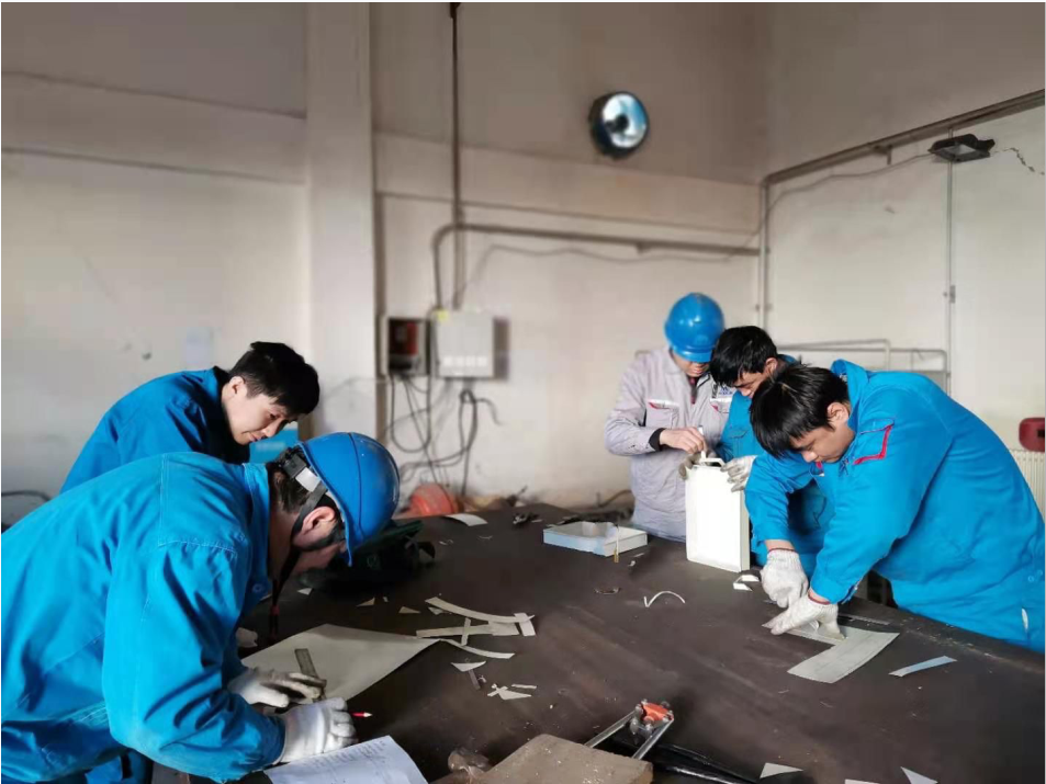 春節(jié)剛過,電廠檢修部機務(wù)操作間里一片忙碌景象。大家手持鋼板尺、錘頭和鐵皮剪等工具,正爭先恐后的進行著一場激烈的技能比賽——制作鐵皮油盤。