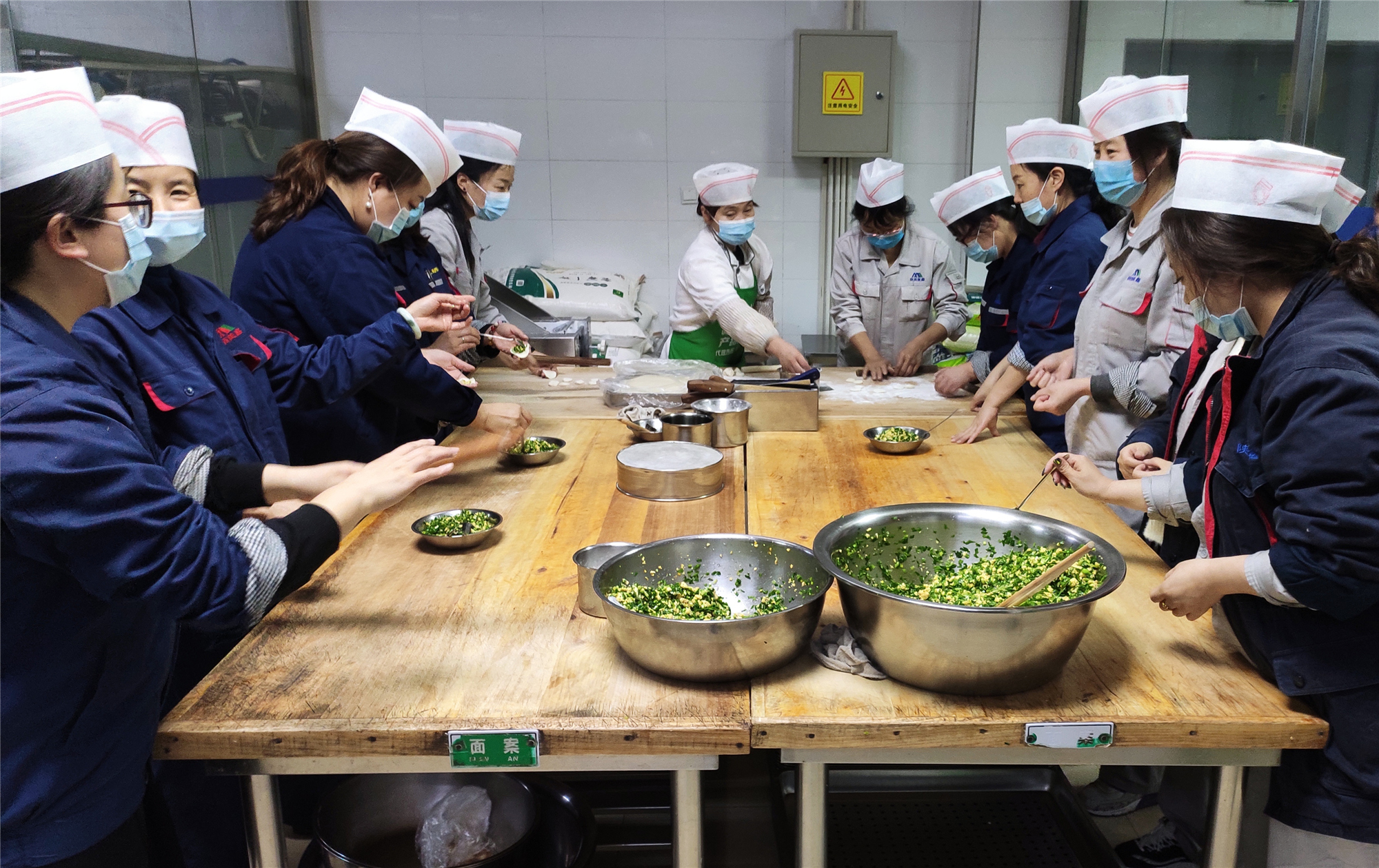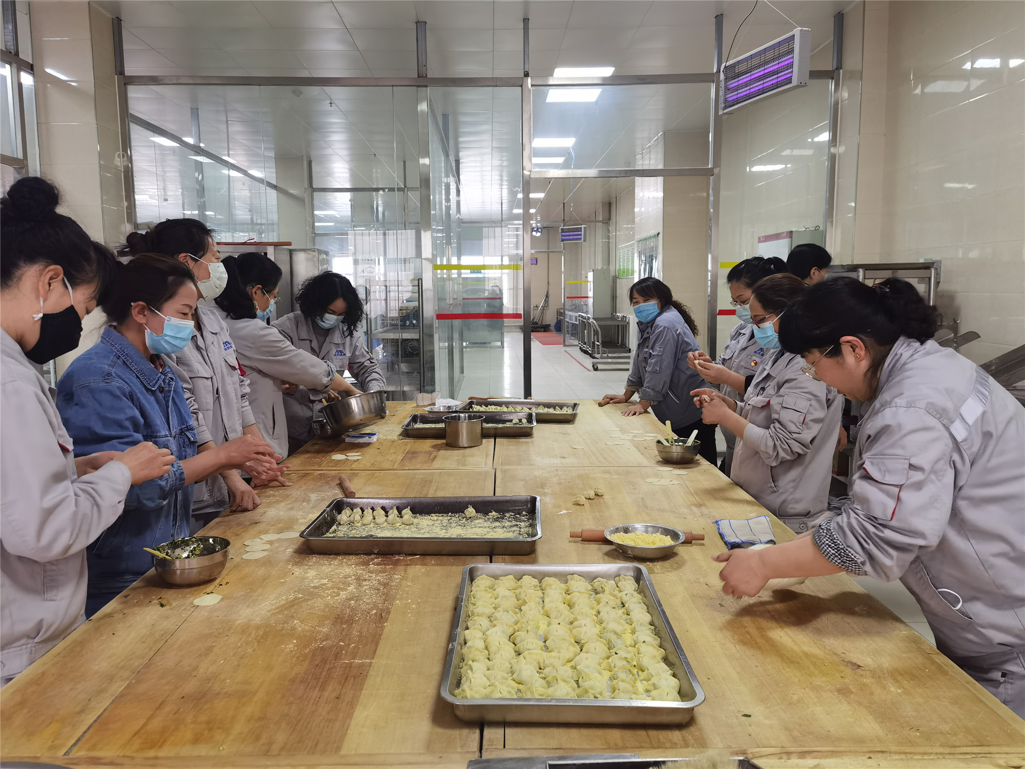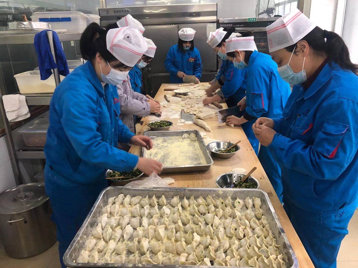 為組織好此次活動,公司女工委與后勤服務(wù)中心積極溝通,提前進(jìn)行了精心的準(zhǔn)備。25日下午1點,在女工委和各分工會的號召下,機(jī)關(guān)各部門及各單位女職工代表齊上陣,分別走進(jìn)機(jī)關(guān)、鋁鎂合金分公司、陽極分公司以及錦陽電廠的職工食堂,桌上已經(jīng)準(zhǔn)備好了餡料和餃子面。女工們紛紛拿出各自的看家本領(lǐng),揪擠子、搟餃子皮、包餃子,忙的不亦樂乎。大家自行組隊,分工明確,有的用料十足,包出的餃子像個“胖娃娃”;有的包出的餃子精致美觀,遠(yuǎn)看就像一件雕刻精美的小藝術(shù)品;有的人還在學(xué)習(xí)階段,費勁半天也只是湊合將餃子的“嘴巴合攏”......整個活動過程中,大家時而探討心得,時而過招切磋,歡聲笑語不斷。經(jīng)過大家的共同努力,一排排千姿百態(tài)、各具特色的餃子很快就擺滿了一個個盤子。看著自己包的餃子,大家的臉上都洋溢著微笑。