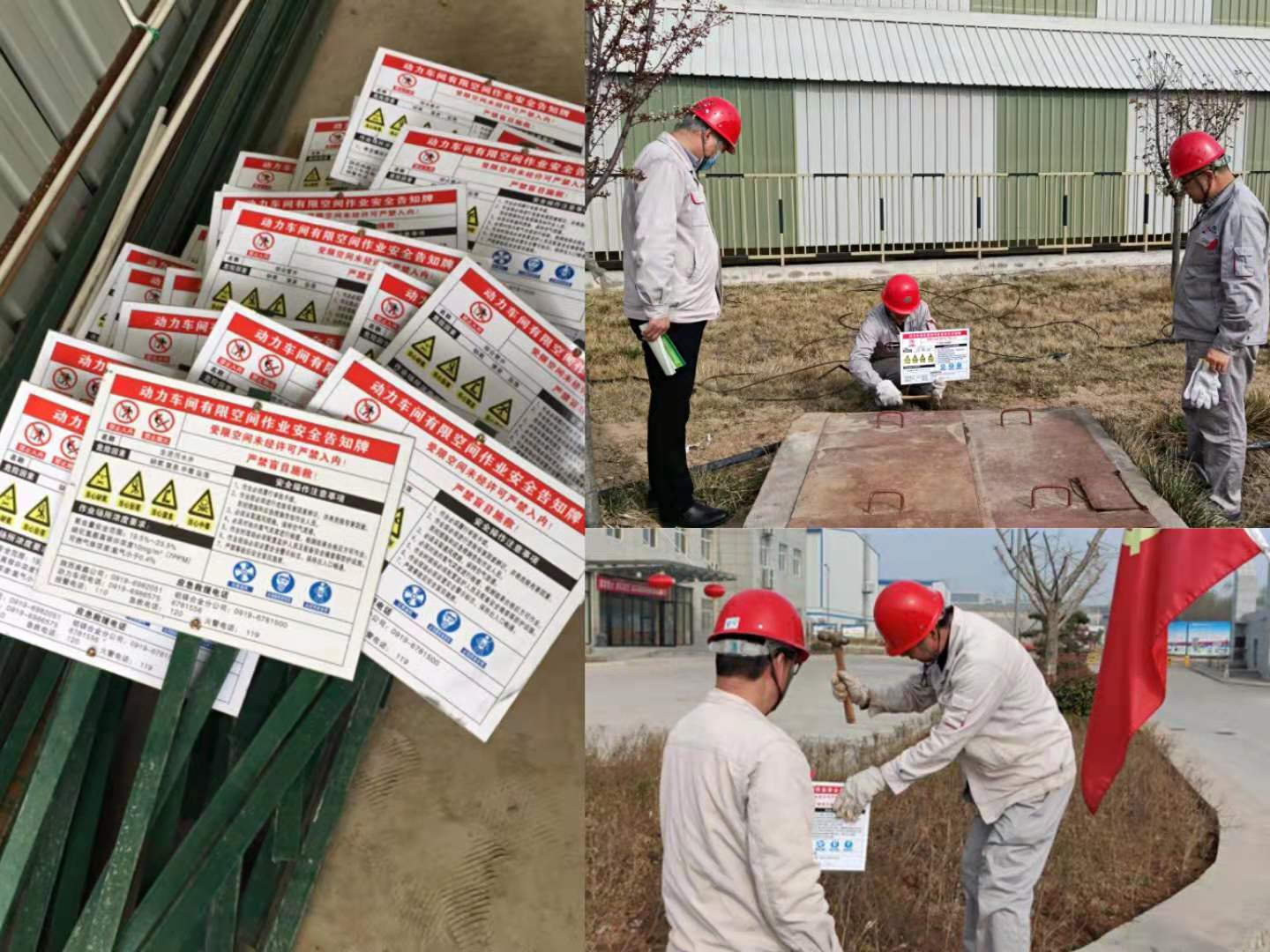 為節(jié)約費用,降本增效,車間自己動手制作了安裝支架,并針對綜合管溝、雨水、生產(chǎn)生活水井等重點部位設(shè)置安全警示牌、告知牌。車間積極發(fā)動組織廣大黨員、職工第一時間安裝到位。安全告知警示語簡潔明了,警示牌色彩鮮艷,起到良好的警示安全告知作用。