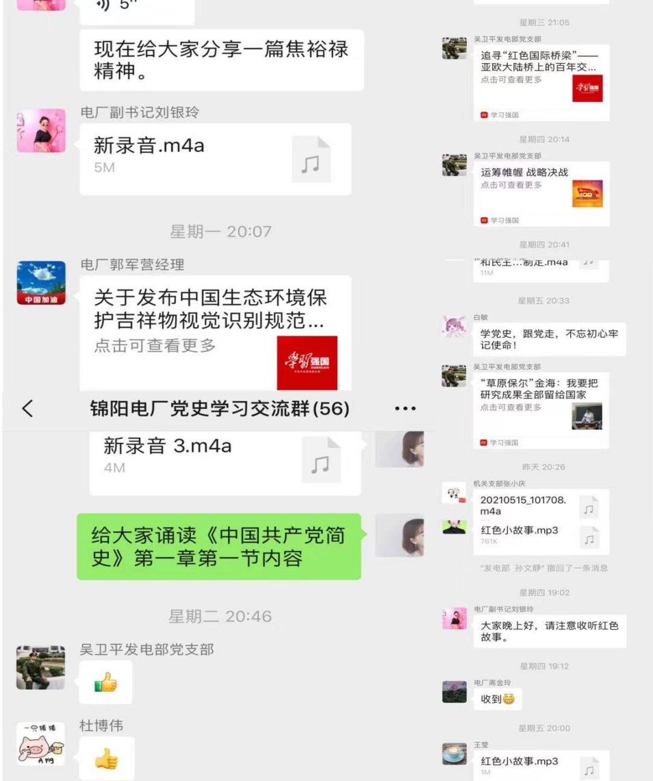 為強(qiáng)化學(xué)習(xí)交流,讓全體黨員職工參與到黨史學(xué)習(xí)中來,特創(chuàng)立錦陽電廠黨史學(xué)習(xí)交流群,通過黨史學(xué)習(xí)交流群以及工會“1+X+100”工作群,要求大家以“今天我是誦讀人”的新形式,按序每日誦讀原著、講紅色故事,并錄制音頻于群內(nèi)分享;顒娱_始后,大家積極響應(yīng),相繼對《論中國共產(chǎn)黨歷史》、《毛澤東、鄧小平、江澤民、胡錦濤關(guān)于中國共產(chǎn)黨歷史論述摘編》、《習(xí)近平新時代中國特色社會主義思想學(xué)習(xí)問答》、《中國共產(chǎn)黨簡史》、紅色故事、革命先烈先進(jìn)事跡等學(xué)習(xí)音頻進(jìn)行微分享,大大提高了黨史學(xué)習(xí)教育的吸引力、互動性和感染力。截止63日,分享誦讀音頻共計58篇。
