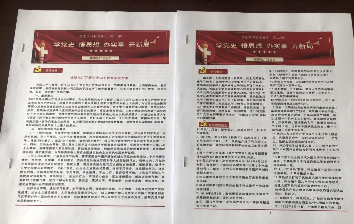 自黨史學(xué)習(xí)教育開展以來,結(jié)合“線上+線下”的學(xué)習(xí)方式,錦陽電廠以百年黨史中的重要事件、重要人物、重要精神,編制錦陽電廠黨史學(xué)習(xí)教育專刊,打造學(xué)習(xí)教育新陣地,不斷展示廣大黨員干部從歷史中汲取思想的力量、信仰的力量、道德的力量、實踐的力量和走向未來的智慧。為強(qiáng)化效果,編發(fā)黨史學(xué)習(xí)應(yīng)知應(yīng)會100題,充分利用黨員干部的碎片化時間進(jìn)行學(xué)習(xí),進(jìn)一步推進(jìn)黨史學(xué)習(xí)教育走心、走實。