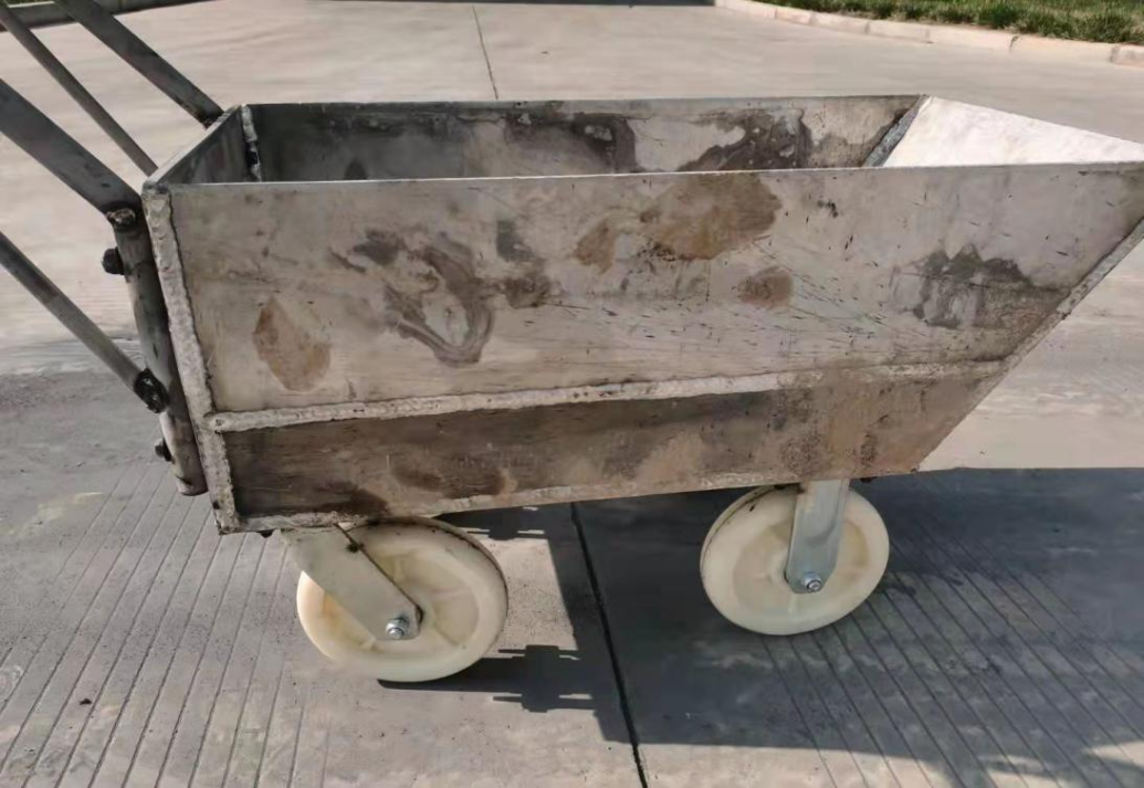 為解決此問題,電解二車間技術(shù)創(chuàng)新小組于今年4月份加工改造電解槽穿槽小車。車斗為10mm厚鋁板制作,上部為80cm,下部為60cm,42cm,30cm,小車主把、輔筋都采用不銹鋼管制作,不僅輕巧耐用,而且能有效防止電解槽磁場影響。合理的尺寸設(shè)計充分利用了兩槽中間位置的有效空間,有效避過槽體AB面中間穿槽母線阻擋,使小車能夠在風(fēng)格網(wǎng)來回穿梭,運(yùn)送物料極為方便,一人便可輕松操作。