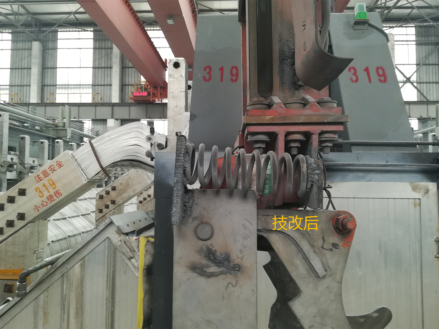 多功能天車是電解生產(chǎn)的主要設(shè)備,承擔著車間電解槽的出鋁、陽極更換、母線提升、氟化鋁添加等多項工作任務(wù)。 其中陽極更換作業(yè)時,技術(shù)要求較高,陽極扳手套筒需精確對位、準確下落,稍有偏差將無法套住卡具螺母,則需人工反復(fù)校正。天車出廠時自帶的4根陽極“扳手回位頂絲”,因為換極作業(yè)中的頻繁使用,容易發(fā)生彎曲變形導(dǎo)致無法套入卡具螺母,使用周期較短,需要換極工通過用手推、扳陽極扳手才能套住螺母完成松卸卡具工作。 車間技術(shù)革新小組了解到這一情況后,主動承擔起了這項技術(shù)改造難題。經(jīng)過一段時間的觀察、研究、反復(fù)試驗,最終技術(shù)革新小組利用彈簧的有效伸縮性代替現(xiàn)有“扳手回位頂絲”的方式解決了這一難題。改進后的陽極“扳手回位頂絲”通過將舊彈簧兩邊焊接在頂板上代替原廠頂絲,充分利用彈簧的復(fù)位功能,緩沖了扳手在松、緊螺母過程中造成的受力偏移,使陽極扳手能夠迅速、準確套住卡具螺母,使用壽命大大延長。這一技術(shù)改造,不僅給維修人員減輕了工作量,降低了維修材料成本,還有效避免了人工手扶夾具出現(xiàn)“夾手”安全事故的發(fā)生,為車間的“雙預(yù)防”奠定了堅實的基礎(chǔ)。 電解一車間的這次“五小”革新,本著化繁就簡的工作理念,從點滴細微處著眼,將創(chuàng)新作為源動力,打破慣性思維,以修舊利廢為目標,動心、動手、動腦逐步實現(xiàn)技術(shù)升級改造,以技術(shù)創(chuàng)新打造車間安全生產(chǎn)新理念。 |