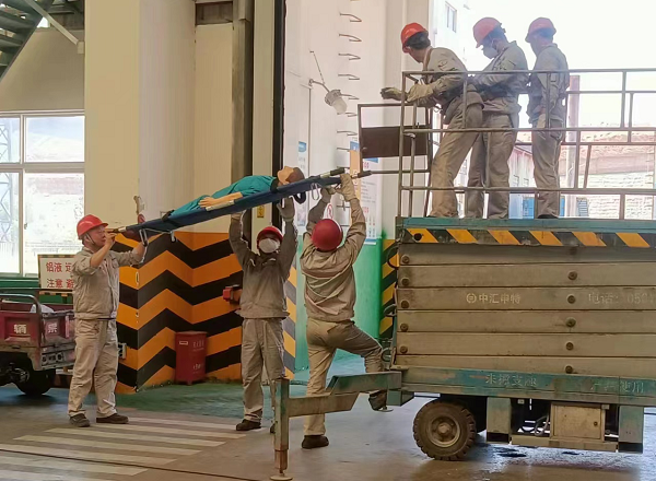 為貫徹落實鋁鎂合金分公司重大事故隱患專項排查整治2023行動實施方案,確保檢修人員進行高空、高溫作業(yè)中暑時能迅速、正確的進行救助,保障職工生命安全。6月14日檢修車間攜手電解一車間組織在崗職工進行了“電解車間高空作業(yè)中暑應急演練”。 演練前,檢修車間組織全體參演人員集中學習了演練預案,進一步熟悉中暑的癥狀及救治注意事項等。演練現(xiàn)場模擬一名檢修工在巡檢電解多功能機組時發(fā)生高溫中暑暈倒,監(jiān)護人員發(fā)現(xiàn)后,立即電話向車間主任匯報,車間主任隨即下令啟動應急預案。救援人員攜帶必要等救援物資快速到達救援現(xiàn)場,利用升降平臺、擔架進行救援等分工協(xié)作展開救援,很快中暑人員被安全運送至通道口通風良好處,進行心肺復蘇急救后,用濕毛巾擦拭中暑人員頭部、胸前,為中暑人員進行物理降溫的同時給其喝下藿香正氣水。不一會中暑人員癥狀便有明顯改善,休息片刻便能自行站立,至此演練結(jié)束,車間主任石登強對演練做了總結(jié),并提出不足,將在后期補充方案加以完善。 本次演練,有效檢驗了檢修車間應對突發(fā)事件的應急處置能力,讓大家現(xiàn)場學習了中暑的癥狀、急救知識,有效提高了檢修車間應對突發(fā)事件的應急處置能力,檢修車間全體員工將銘記“人人講安全、個個會應急”的安全生產(chǎn)月主題,嚴格落實各項安全管控措施,確保分公司年度各項安全目生產(chǎn)標順利實現(xiàn)。 |