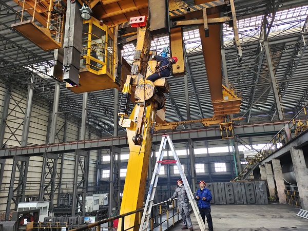 陽極分公司焙燒多功能天車是焙燒爐裝出陽極塊的主要設備,隨著使用年限的增加,天車夾具各機構(gòu)出現(xiàn)磨損變形情況,致使天車存在散爪安全隱患。 針對此項隱患,分公司高度重視,成立由設備管理部牽頭、焙燒車間專業(yè)技術(shù)人員配合的攻關(guān)小組,通過對天車夾具主要機構(gòu)磨損老化程度分析研判,明確故障原因及解決方案。設備管理部積極協(xié)調(diào),快速完成定制備件的采購供貨任務,并聯(lián)系對接廠家專業(yè)技術(shù)人員現(xiàn)場指導。焙燒車間檢修技術(shù)人員協(xié)同配合,對天車夾具、中間拉桿、開啟機構(gòu)等設備進行矯正修復更換。經(jīng)歷5天的拆除、修整、裝配及反復調(diào)試,于10月24日順利完成了#1多功能天車#2夾具的大修工作。 大修后的多功能天車夾具運行平穩(wěn)、機構(gòu)動作順暢可靠,有效提升了設備本質(zhì)安全性能,保證了自用極和代焙塊的裝出爐工作,也為分公司今后自主完成大型設備的安裝調(diào)試積累了豐富經(jīng)驗。 |