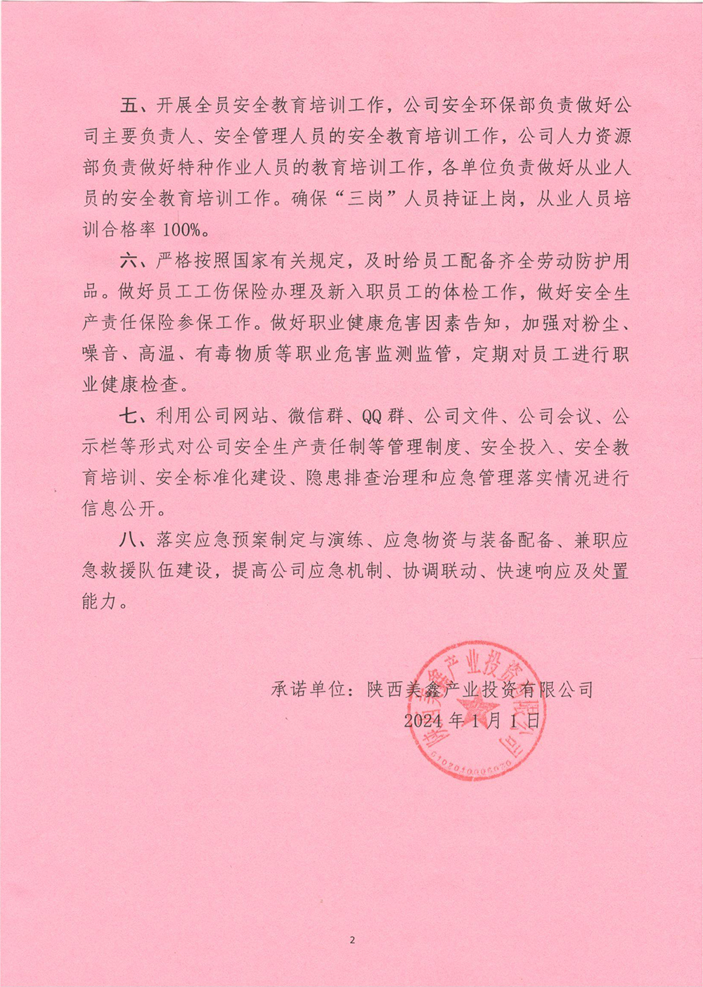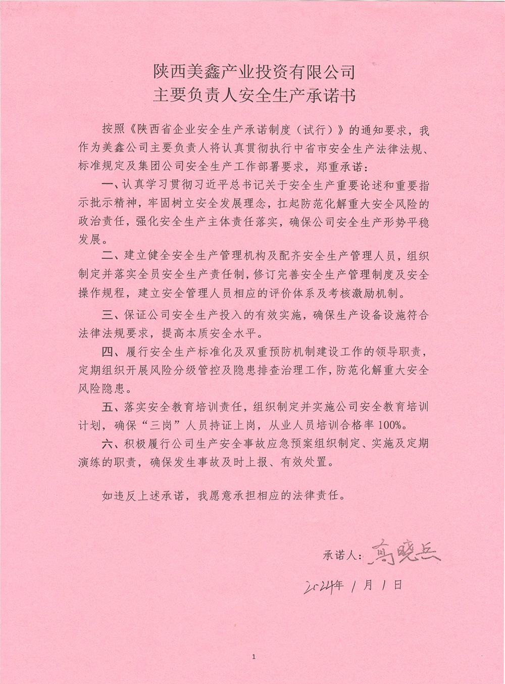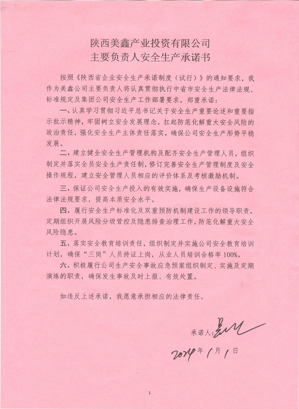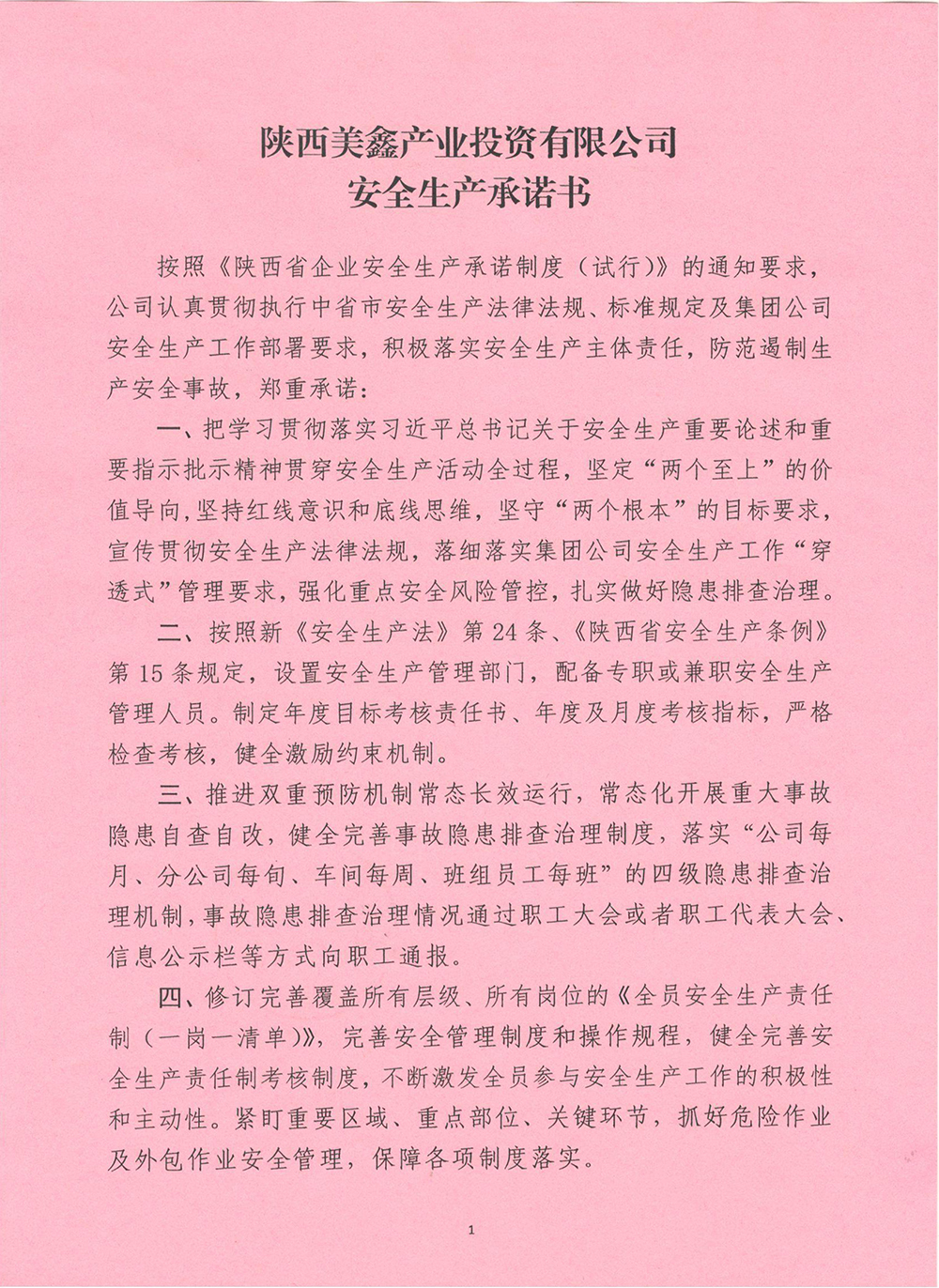 陜西美鑫產(chǎn)業(yè)投資有限公司安全生產(chǎn)承諾