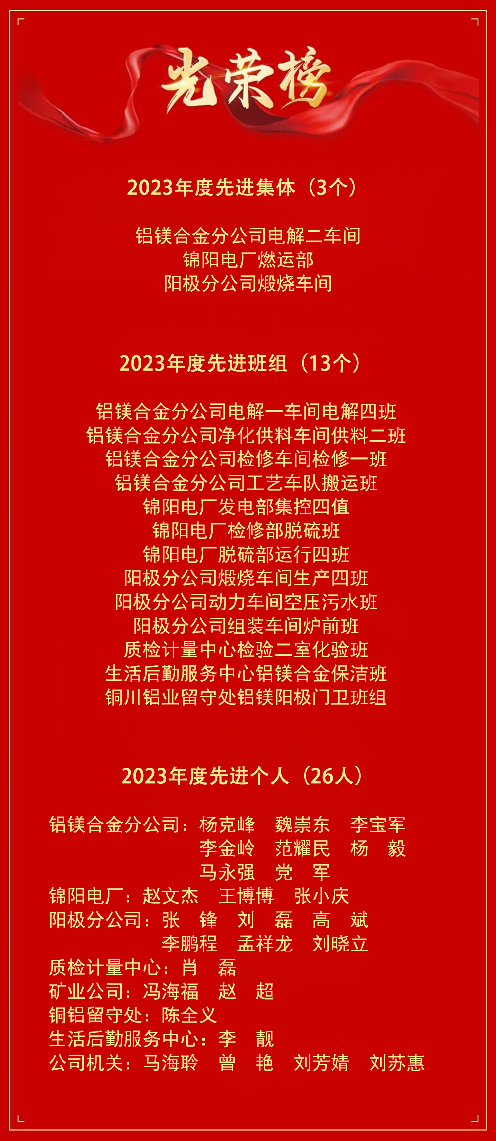 2023年,在集團公司的正確領(lǐng)導(dǎo)下,公司上下以習(xí)近平新時代中國特色社會主義思想為指引,全面貫徹落實黨的二十大精神,在廣大干部職工的共同努力下,安全生產(chǎn)、經(jīng)營工作、精益管理等各項工作取得了顯著成績,涌現(xiàn)出一批先進集體和先進個人。 為表彰先進,樹立典型,進一步激發(fā)廣大職工的工作積極性和熱情,經(jīng)基層單位推薦申報,公司先進評選委員會審核,公司黨委研究決定:授予鋁鎂合金分公司電解二車間等 3 個單位“先進集體”榮譽稱號;授予錦陽電廠發(fā)電部集控四值等 13 個班組“先進班組”榮譽稱號;授予楊克峰等 26 名同志“先進個人”榮譽稱號。 希望各單位和全體干部職工向受表彰的先進集體和先進個人學(xué)習(xí),以他們?yōu)榘駱,團結(jié)協(xié)作、開拓進取、扎實工作、全力以赴,為公司高質(zhì)量發(fā)展做出新的更大的貢獻! |