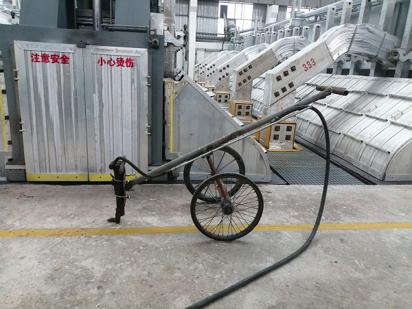 500KA大型電解槽的前后兩端分別各有一個(gè)直徑約35-40公分的圓形洞口,主要用于鋁液吸出、炭渣打撈、物料添加、效應(yīng)熄滅、爐底勾帶等日常作業(yè),但是由于電解質(zhì)溶液的不斷凝固,需要定期對(duì)前后端洞口進(jìn)行擴(kuò)展維護(hù)。