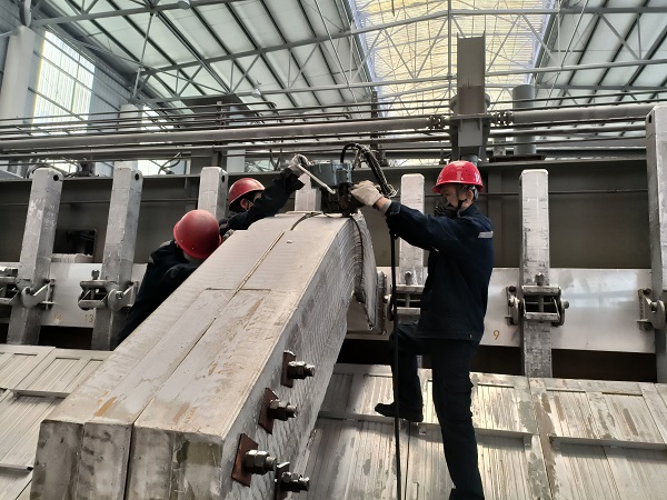 電解槽進(jìn)電端軟連接是立柱母線與平衡母線重要的連接部件,起到導(dǎo)電作用,使立柱母線在上下移動過程中不會破壞母線結(jié)構(gòu)。 但在電解作業(yè)過程中,天車打殼機(jī)頭易碰撞到軟連接,致使其產(chǎn)生破損,從而導(dǎo)致壓降增大、電耗增高,直接影響到生產(chǎn)實際。針對此種情況,車間安排綜合班人員在不影響正常生產(chǎn)的情況下,對電解槽進(jìn)電端軟連接鋼帶損壞、脫落部分進(jìn)行捆扎修復(fù)。經(jīng)過5天的努力,600余條電解槽進(jìn)電端軟連接全部修復(fù)完畢,消除了軟連接破損造成的安全隱患和能源消耗。 此次修復(fù)工作,是電解二車間響應(yīng)公司“降本增效”號召的又一有力舉措。今后,車間將持續(xù)引導(dǎo)動員職工積極參與生產(chǎn)設(shè)備設(shè)施的改造、修復(fù),降低生產(chǎn)成本,減少能源損耗,以實際行動助力綠色低碳發(fā)展。 |