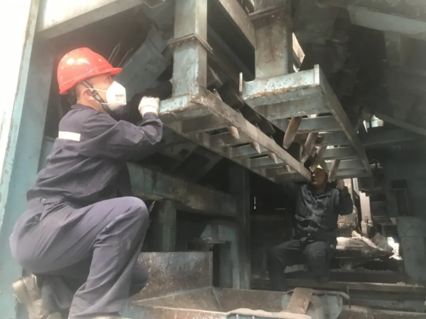 5月中旬,隨著陽極分公司組裝車間1#電解質(zhì)清理機技改完成和試運行結(jié)束,困擾車間電解質(zhì)清理的“桎梏頑疾”終于得到了有效解決。去年3月,車間對2#清理機進行了嘗試性改造,改造后不斷調(diào)整技術(shù)參數(shù)、優(yōu)化作業(yè)方式、總結(jié)運行經(jīng)驗。今年3月底,結(jié)合2#清理機改造經(jīng)驗,車間又對1#清理機實施了改造,目前2臺清理機均已投入使用,設(shè)備運行結(jié)構(gòu)更加穩(wěn)定安全,故障率顯著降低,職工勞動強度大大減輕,清理效率提升了20%以上。 電解質(zhì)清理機自2018年投運以來,由于長期運行清理效果逐漸下降,設(shè)備故障率居高不下,嚴重影響了車間生產(chǎn)。如何解決電解質(zhì)清理的“卡脖子”問題,車間經(jīng)過深入分析,查找確定問題根源。在具體改造實施過程中,車間大膽嘗試創(chuàng)新,借鑒同行業(yè)先進經(jīng)驗增加了破碎錘工位,加裝了5個圓形錘,以3尖錘預破碎、5圓錘精破碎的工作方式,多角度覆蓋破碎擊打點;調(diào)整鋼爪定位機構(gòu)固定位置,確保擊打區(qū)域?qū)崿F(xiàn)全方位;為保證擊打力度,車間模擬增加配重實驗,精準施策;為讓設(shè)備運行更加安全平穩(wěn),更改殘極組原有的單側(cè)固定為兩側(cè)固定,改造運行后均取得了良好效果。 下一步,車間將以此次技術(shù)改造為契機,積極開展技術(shù)課堂講座、崗位技能比武、傳幫帶等活動,著力提升職工專業(yè)技能水平。同時,不斷建立健全獎懲管理機制,鼓勵倡導廣大職工為車間技術(shù)創(chuàng)新、小改小革等建言獻策,群策群力解決生產(chǎn)難題,全力保障分公司安全生產(chǎn)平穩(wěn)運行。 |