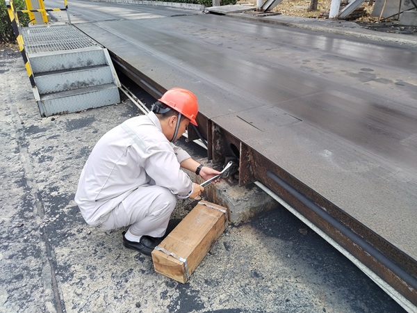 大宗原材料進出場的精準計量是企業(yè)生產(chǎn)平穩(wěn)運行的關(guān)鍵環(huán)節(jié)。7月18日14時20分,質(zhì)檢計量中心接到緊急報告:陽極磅房磅秤突發(fā)傳感器傾斜、秤體移位故障,導致石油焦運輸車輛無法正常過磅。時值高溫保供關(guān)鍵期,若不及時排除故障,將直接影響物料流轉(zhuǎn)效率,甚至延誤生產(chǎn)進度。 靠前指揮強部署 爭分奪秒搶進度 故障就是命令!中心領(lǐng)導班子迅速反應(yīng),第一時間趕赴現(xiàn)場指揮調(diào)度,并抽調(diào)技術(shù)骨干成立搶修小組。搶修人員冒著高溫,對磅秤進行全面排查,迅速鎖定故障原因——由于頻繁使用、且持續(xù)高溫導致磅秤限位間隙縮小,車輛在磅秤上急停致使磅秤傳感器偏移、固定限位松動,造成磅秤部分限位失靈!氨仨氃2小時內(nèi)恢復運行!”中心領(lǐng)導下達硬性指令。在安全管理人員的全程監(jiān)護下,搶修人員迅速制定搶修方案:利用千斤頂穩(wěn)固磅秤中心,多人協(xié)同撬動調(diào)整位移端,重新校準傳感器并精準調(diào)試數(shù)據(jù)。 協(xié)同奮戰(zhàn)保運行 精準調(diào)試穩(wěn)計量 經(jīng)過1小時20分鐘的緊張作業(yè),15時50分,磅秤計量數(shù)據(jù)恢復穩(wěn)定。經(jīng)反復校驗,誤差值嚴格控制在國家標準范圍內(nèi)。等候的運輸車輛隨即有序過磅,生產(chǎn)恢復正常運轉(zhuǎn)。此次搶修比原定預案提前40分鐘完成,最大限度地降低了故障對生產(chǎn)的影響。 |
